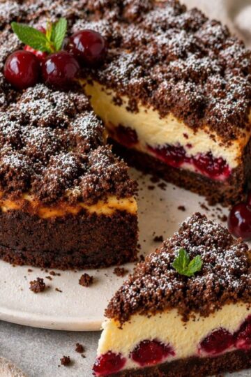 - Sernik z wiśniami i kruszonką – prosty przepis85 minut + studzenie