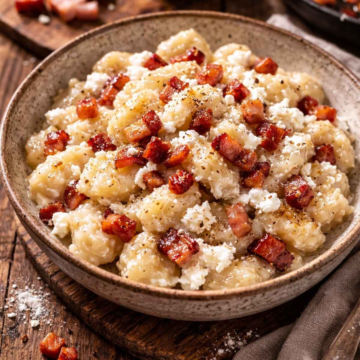 Miękkie, delikatne i polane złocistymi skwarkami – kluski ziemniaczane z twarogiem i skwarkami to prawdziwy smak domowej, babcinej kuchni.