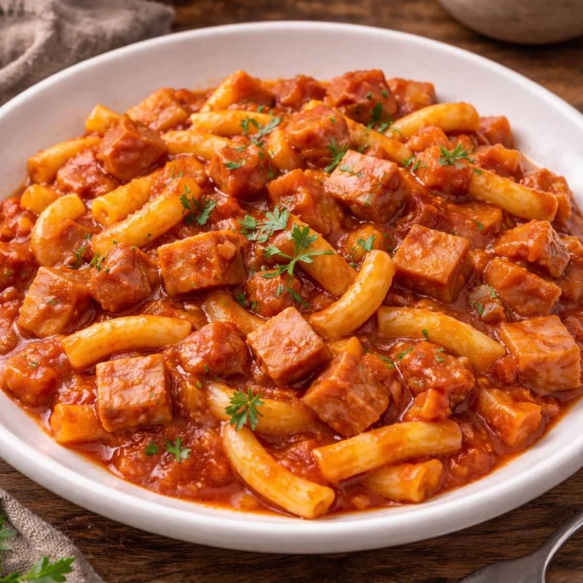 To jedno z tych dań, które przygotowuję zawsze wtedy, gdy nie mam czasu na długie gotowanie, a potrzebuję czegoś konkretnego i domowego. Kiełbasa myśliwska dodaje głębi smaku, sos pomidorowy łączy wszystko w jedną pyszną całość, a makaron... wiadomo – zawsze się sprawdza! To danie, które pamiętam z dzieciństwa – proste, niedrogie i pyszne. Teraz robię je swoim dzieciom i obserwuję, jak znika z talerzy w kilka minut.
