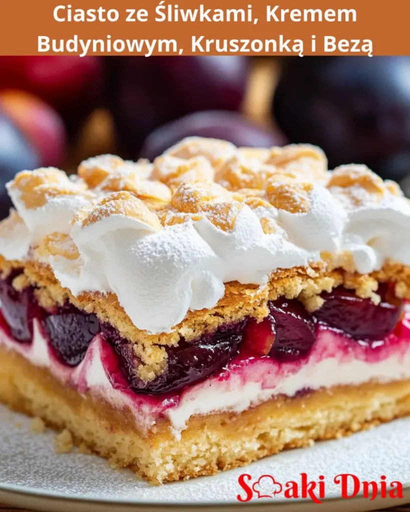 Jeśli szukasz przepisu, który zachwyci Twoich gości i sprawi, że każde spotkanie przy kawie stanie się wyjątkowe, ten przepis na Ciasto ze Śliwkami, Kremem Budyniowym, Kruszonką i Bezą jest dla Ciebie. To ciasto jest prawdziwym arcydziełem – połączenie soczystych śliwek, kremowego budyniu, chrupiącej kruszonki i lekkiej bezy tworzy harmonijną kompozycję smaków, której trudno się oprzeć. To ciasto nie tylko świetnie smakuje, ale też pięknie wygląda, co sprawia, że jest idealne na specjalne okazje, takie jak urodziny, imieniny, czy spotkania rodzinne.