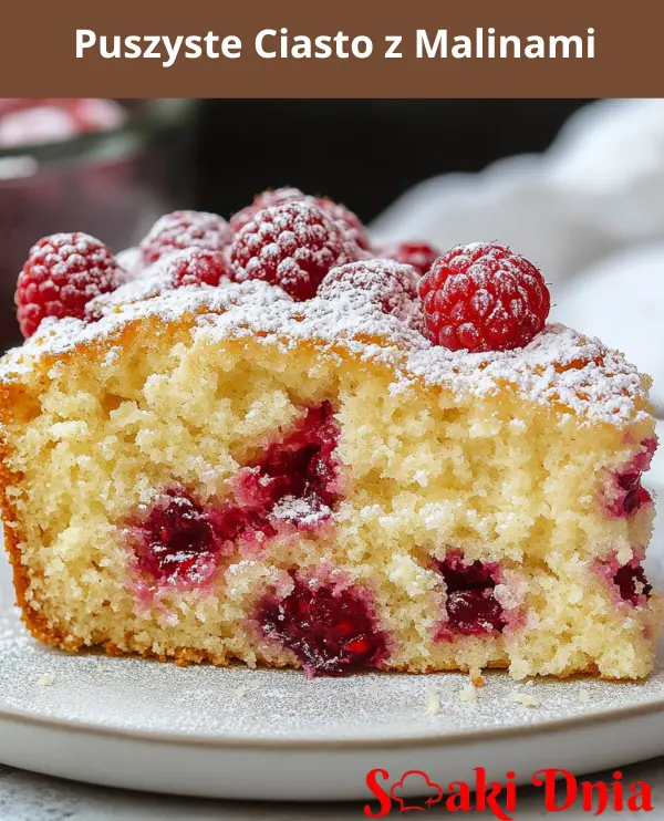 Puszyste ciasto z malinami najlepiej prezentuje się na prostym białym talerzu, posypane lekką warstwą cukru pudru. Można je podać z dodatkową porcją świeżych malin lub gałką lodów waniliowych, które podkreślą smak owoców.