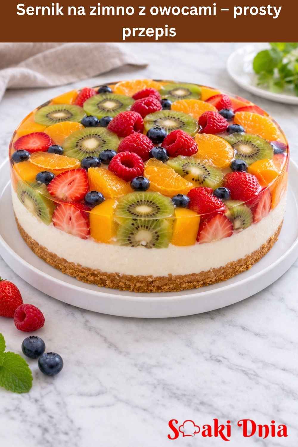 Lekki, kremowy sernik na zimno z owocami i galaretką. Chrupiący spód, delikatna masa i świeże owoce tworzą idealny deser na lato i spotkania z gośćmi.